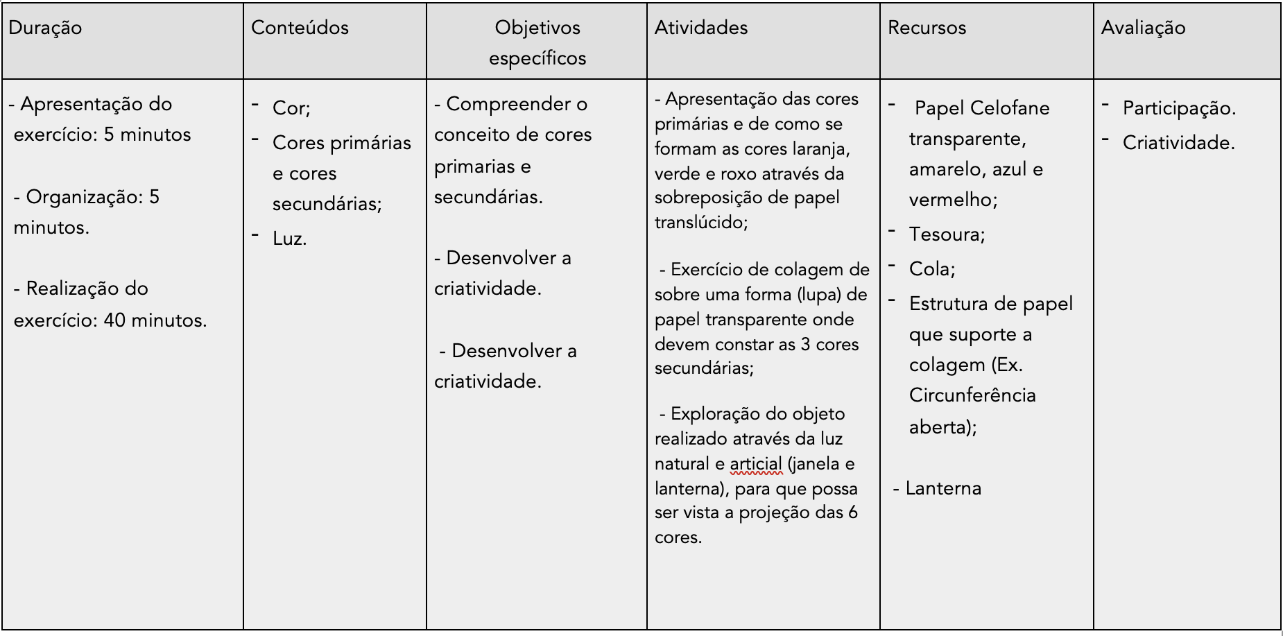 O exercício terá a duração total de 50 minutos e tem como objetivo dar a conhecer de forma lúdica como funcionam as combinações de cores criadas pela mistura igual de duas cores primárias através da luz.